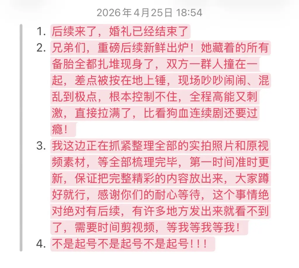 抖音顶级热瓜,418婚礼复仇事件,起因是某博主自曝将联合曾被渣女伤害过感情的6位前男友,前去渣女婚礼现场,曝光此人所作所为,并拆穿她虚伪的面目,后续流出现场视频,因几位前男友的爆料,迎亲团和渣女亲友已经当场开启大乱斗。